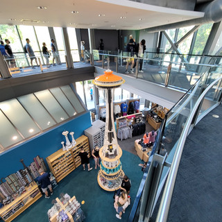 Next, we walked over to the Space Needle. We took the elevator.to the top and walked around the observation deck. On the floor below, we found a glass rotating floor, which was somewhat unnerving.